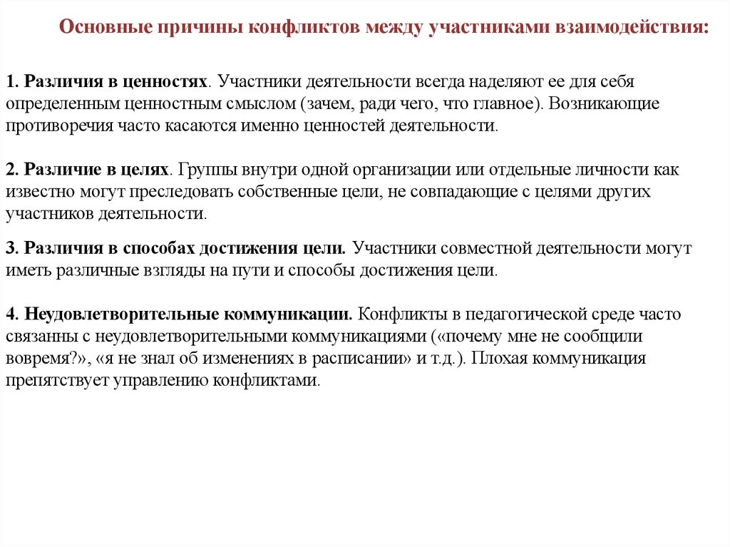 Основные причины конфликтов между участниками взаимодействия:1. Различия в ценностях. Участники деятельности всегда наделяют ее для себя