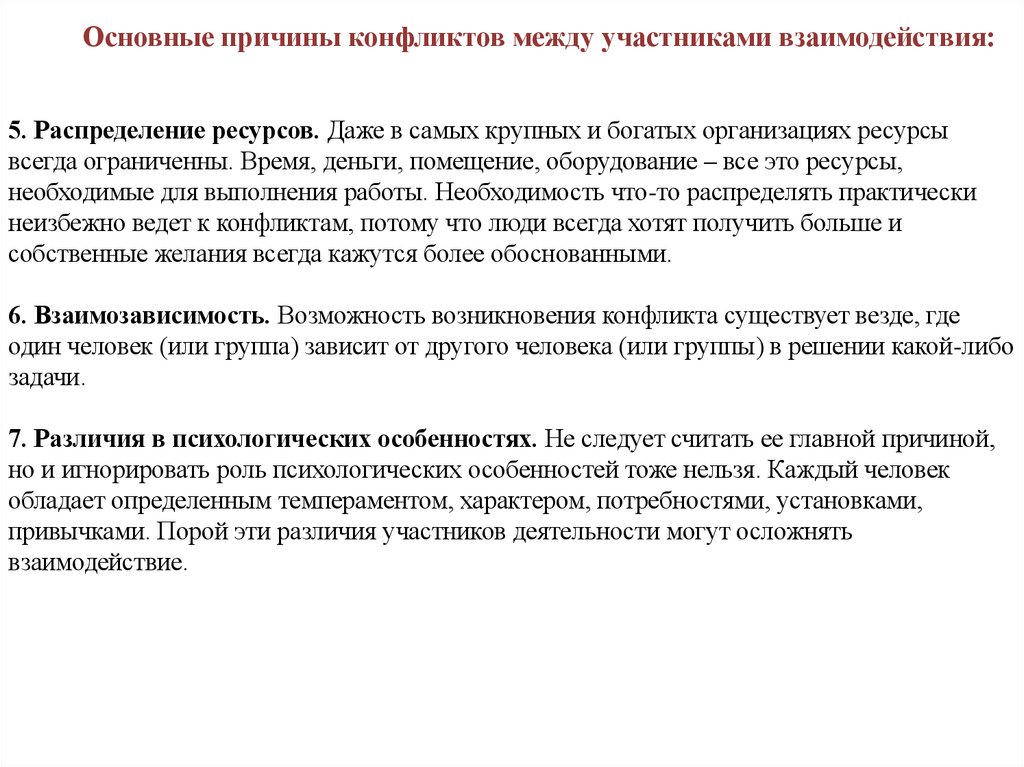 Основные причины конфликтов между участниками взаимодействия:5. Распределение ресурсов. Даже в самых крупных и богатых организациях ресурсы