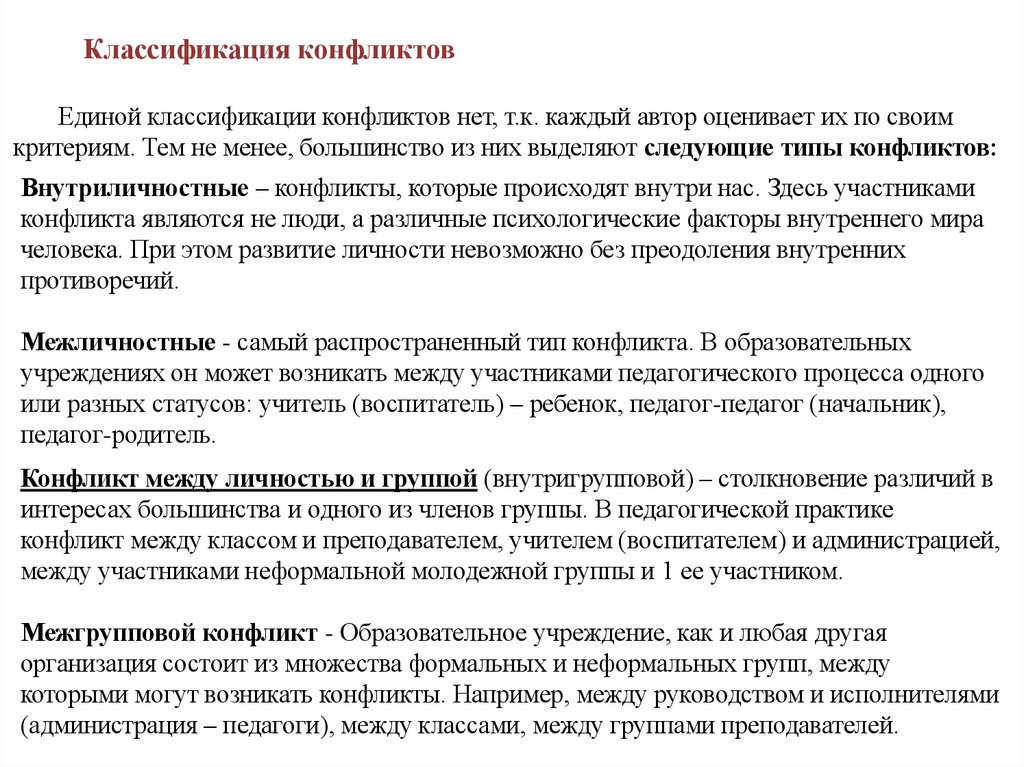 Классификация конфликтовЕдиной классификации конфликтов нет, т.к. каждый автор оценивает их по своим