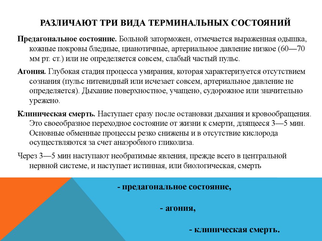 РАЗЛИЧАЮТ ТРИ ВИДА ТЕРМИНАЛЬНЫХ СОСТОЯНИЙПредагональное состояние. Больной заторможен, отмечается выраженная одышка,