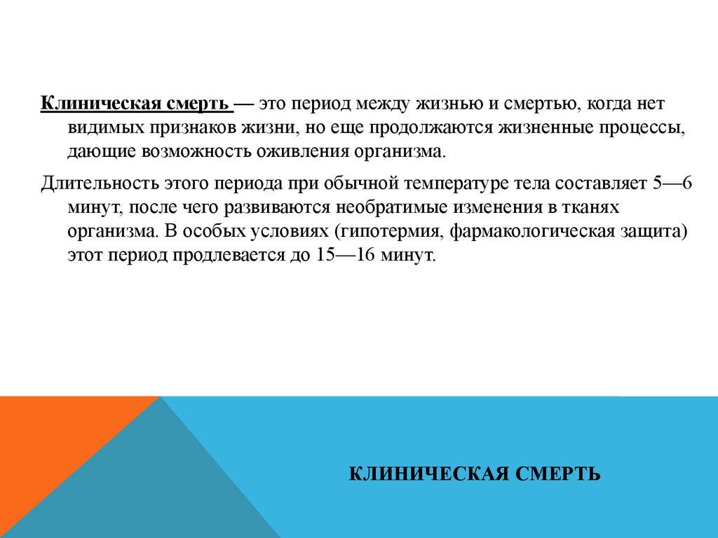 Клиническая смерть — это период между жизнью и смертью, когда нетвидимых признаков жизни, но еще продолжаются жизненные процессы,
