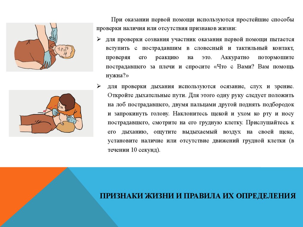 При оказании первой помощи используются простейшие способыпроверки наличия или отсутствия признаков жизни: