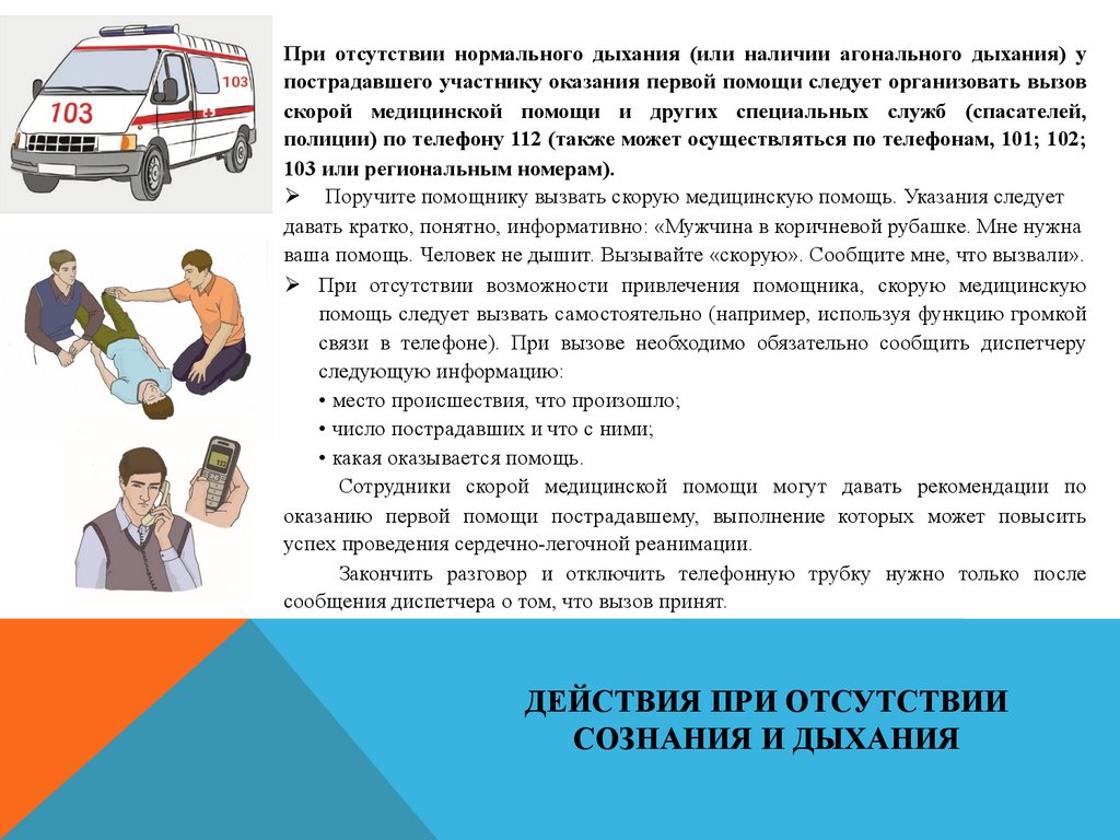 При отсутствии нормального дыхания (или наличии агонального дыхания) упострадавшего участнику оказания первой помощи следует организовать вызов