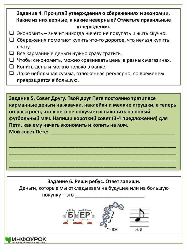 Задание 4. Прочитай утверждения о сбережениях и экономии.Какие из них верные, а какие неверные? Отметьте правильные