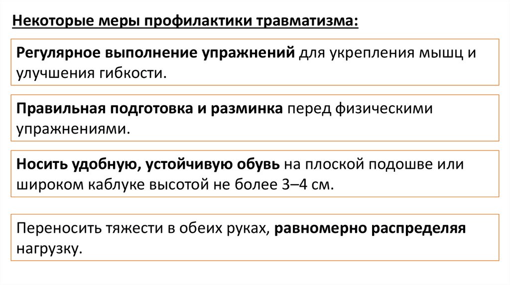 Некоторые меры профилактики травматизма:Регулярное выполнение упражнений для укрепления мышц и