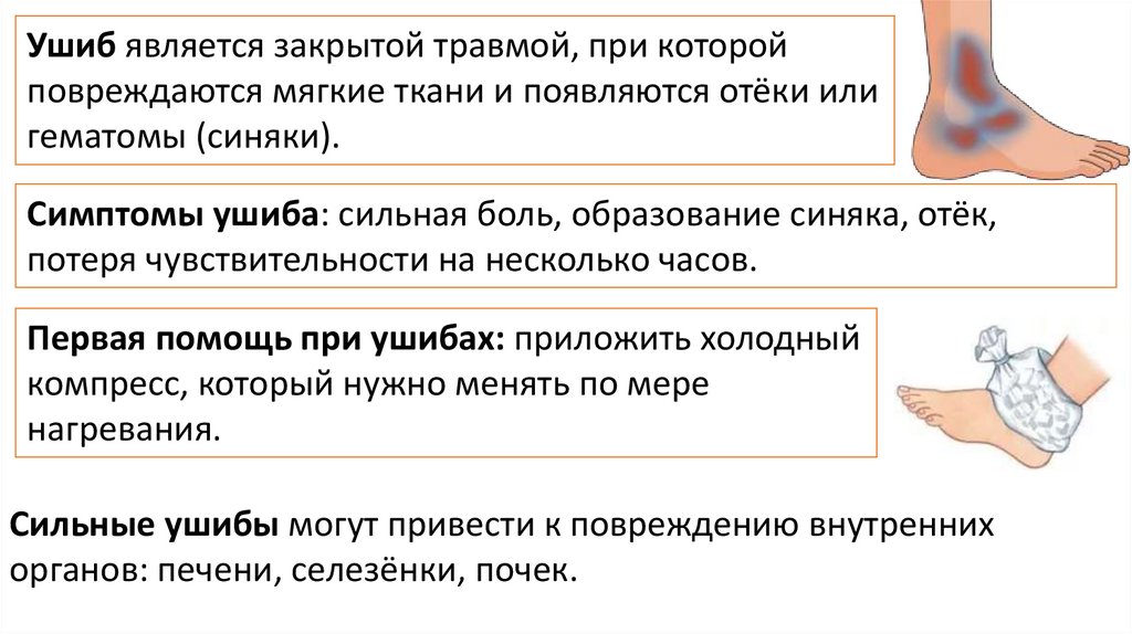 Симптомы ушиба: сильная боль, образование синяка, отёк,