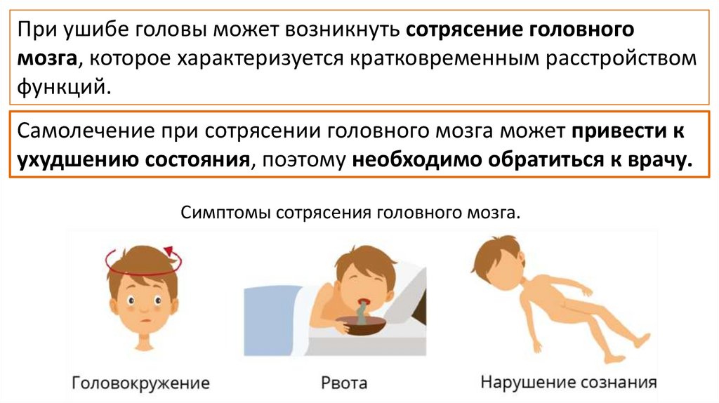При ушибе головы может возникнуть сотрясение головногомозга, которое характеризуется кратковременным расстройством