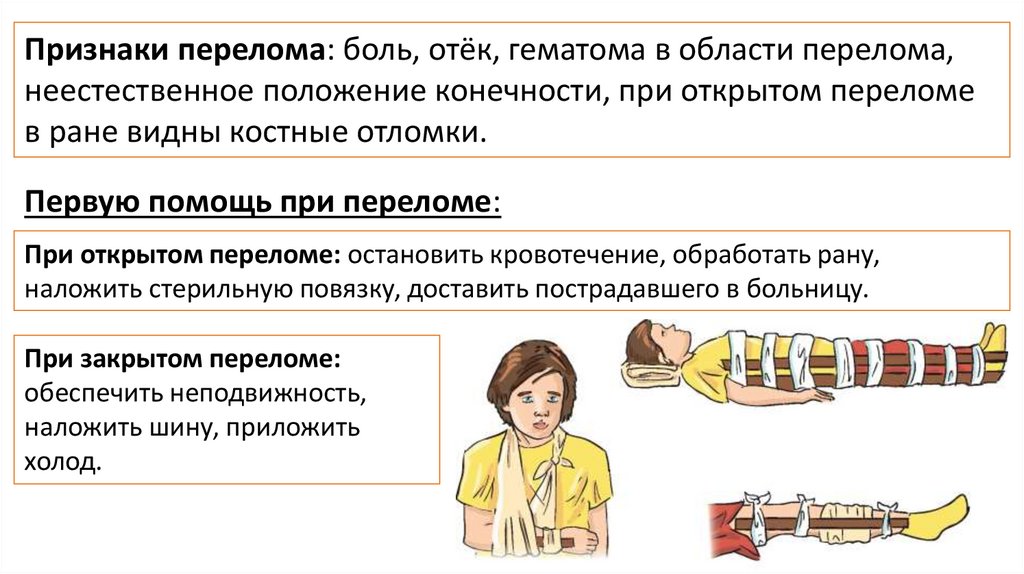 Признаки перелома: боль, отёк, гематома в области перелома,неестественное положение конечности, при открытом переломе