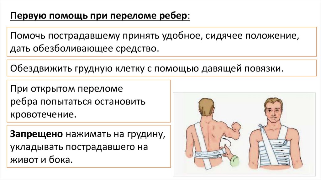 Первую помощь при переломе ребер:Помочь пострадавшему принять удобное, сидячее положение,