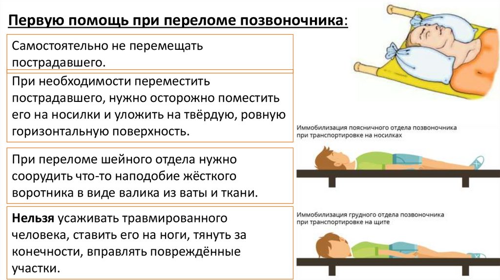 Первую помощь при переломе позвоночника:Самостоятельно не перемещать