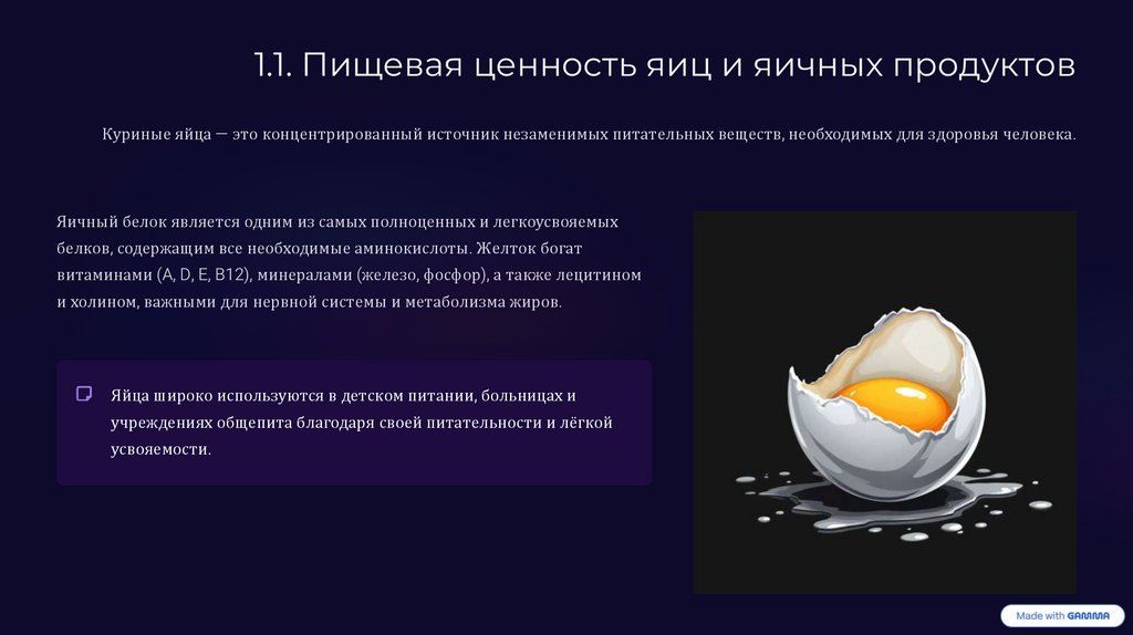 1.1. Пищевая ценность яиц и яичных продуктовКуриные яйца — это концентрированный источник незаменимых питательных веществ, необходимых для здоровья человека.