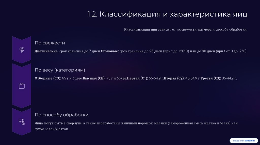 1.2. Классификация и характеристика яицКлассификация яиц зависит от их свежести, размера и способа обработки.