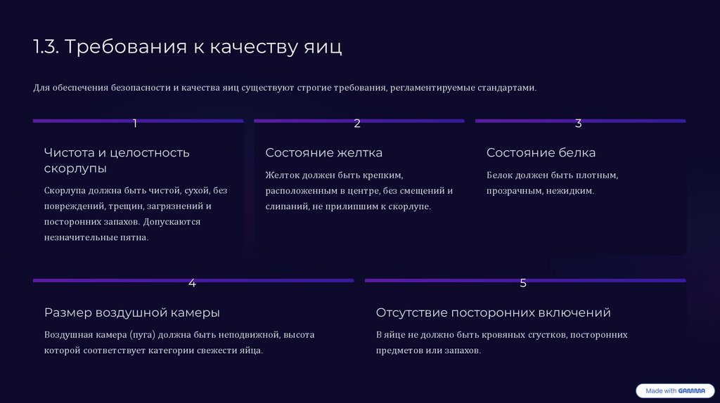 1.3. Требования к качеству яицДля обеспечения безопасности и качества яиц существуют строгие требования, регламентируемые стандартами.