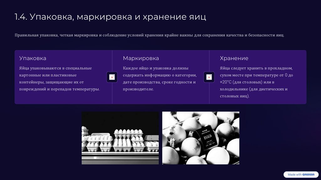 1.4. Упаковка, маркировка и хранение яицПравильная упаковка, четкая маркировка и соблюдение условий хранения крайне важны для сохранения качества и безопасности яиц.