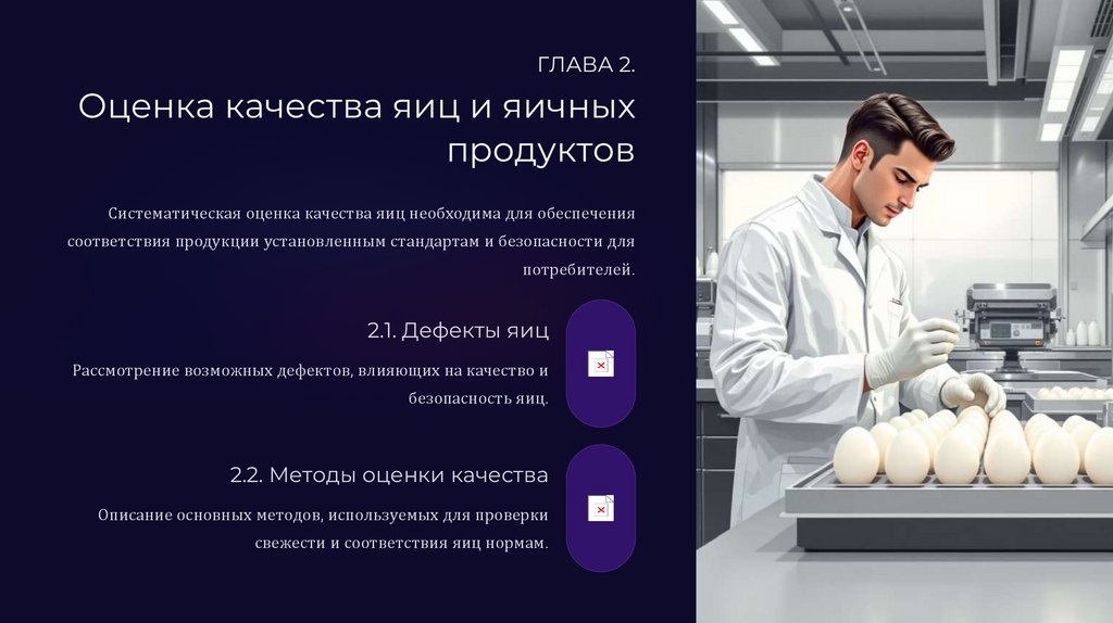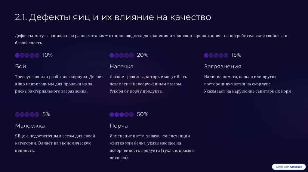 2.1. Дефекты яиц и их влияние на качествоДефекты могут возникать на разных этапах – от производства до хранения и транспортировки, влияя на потребительские свойства и