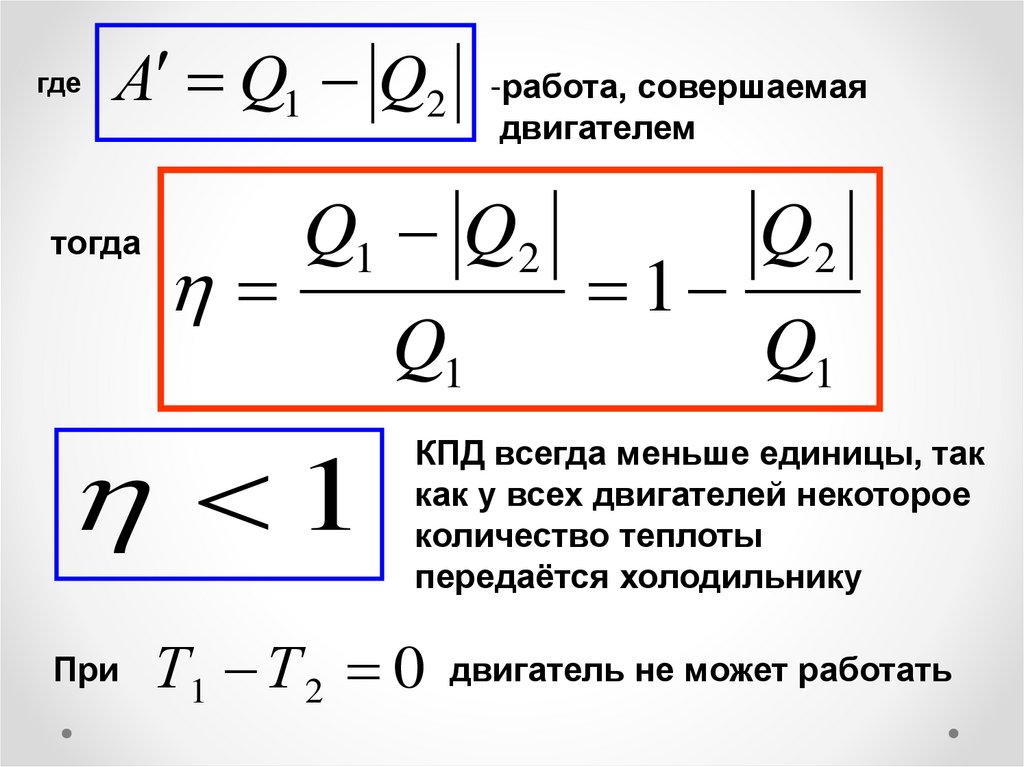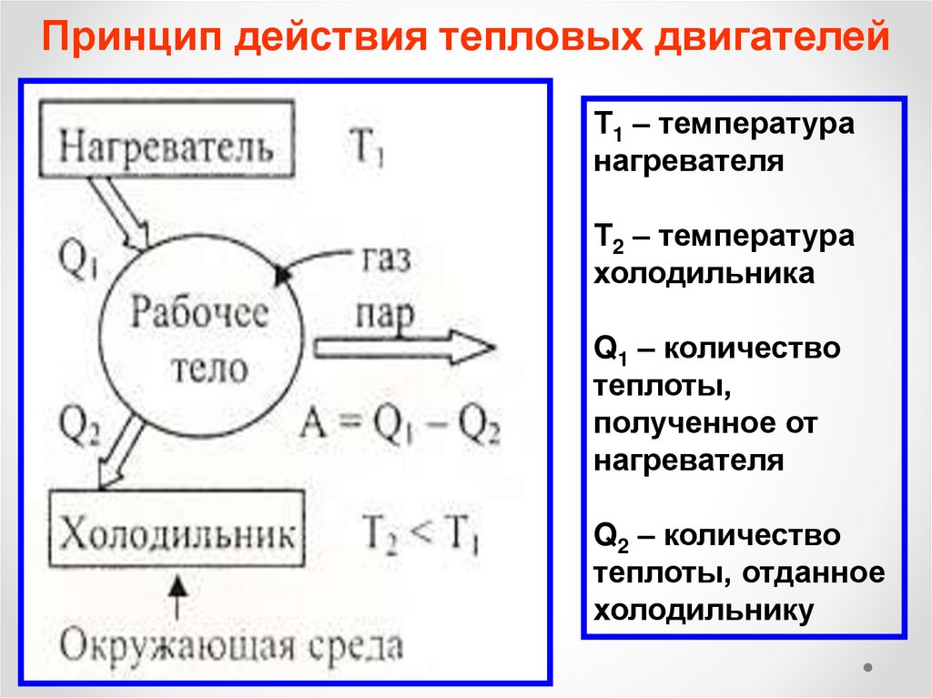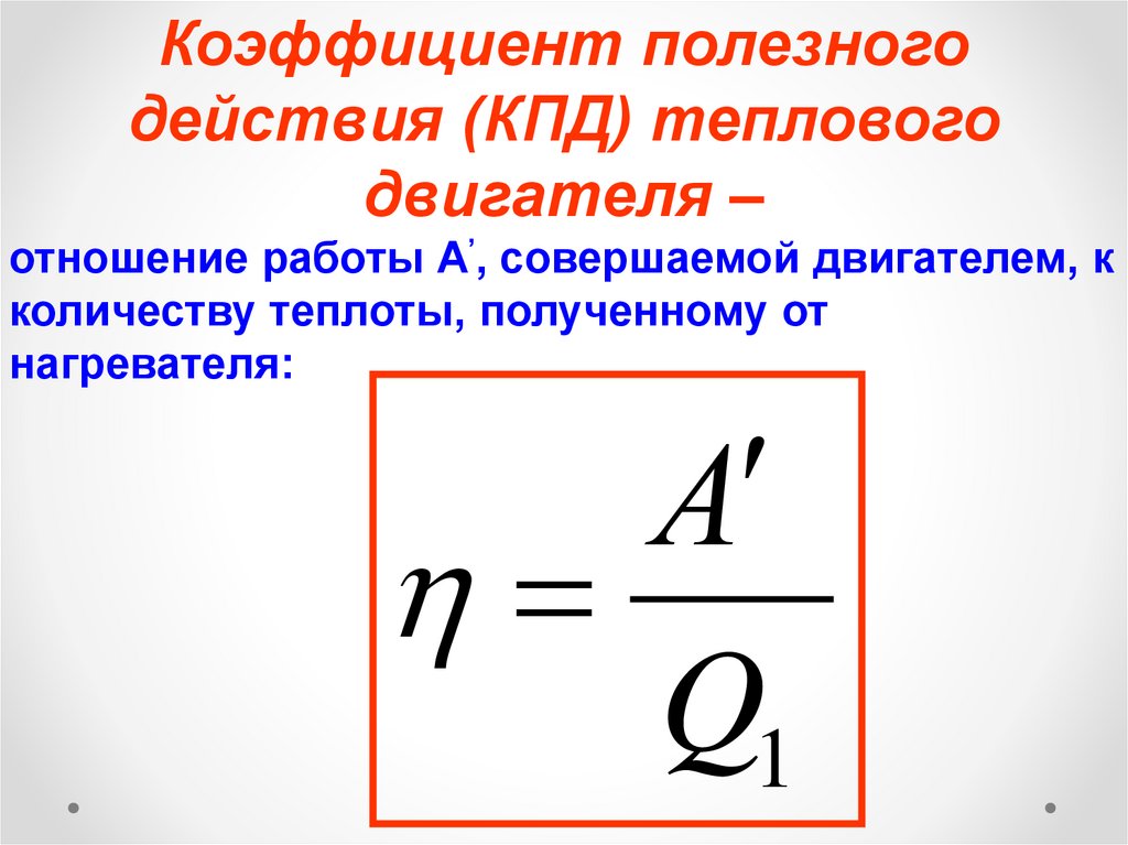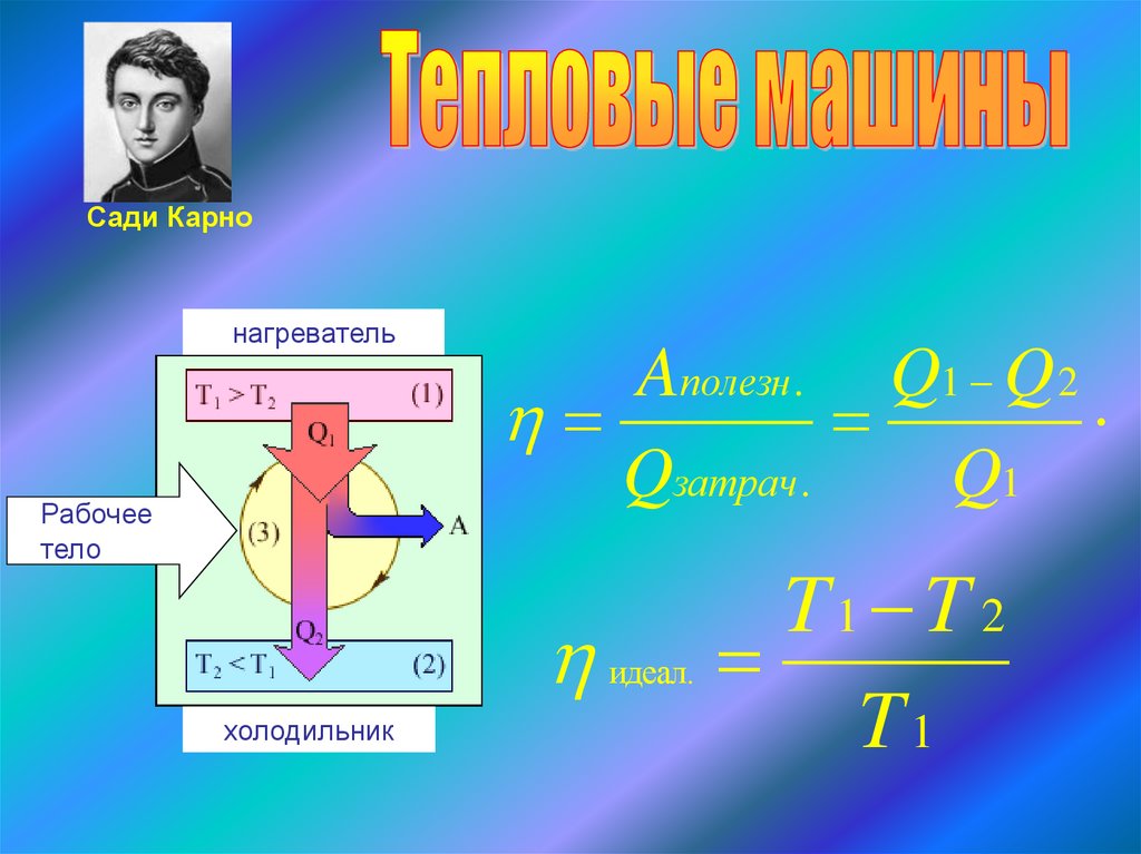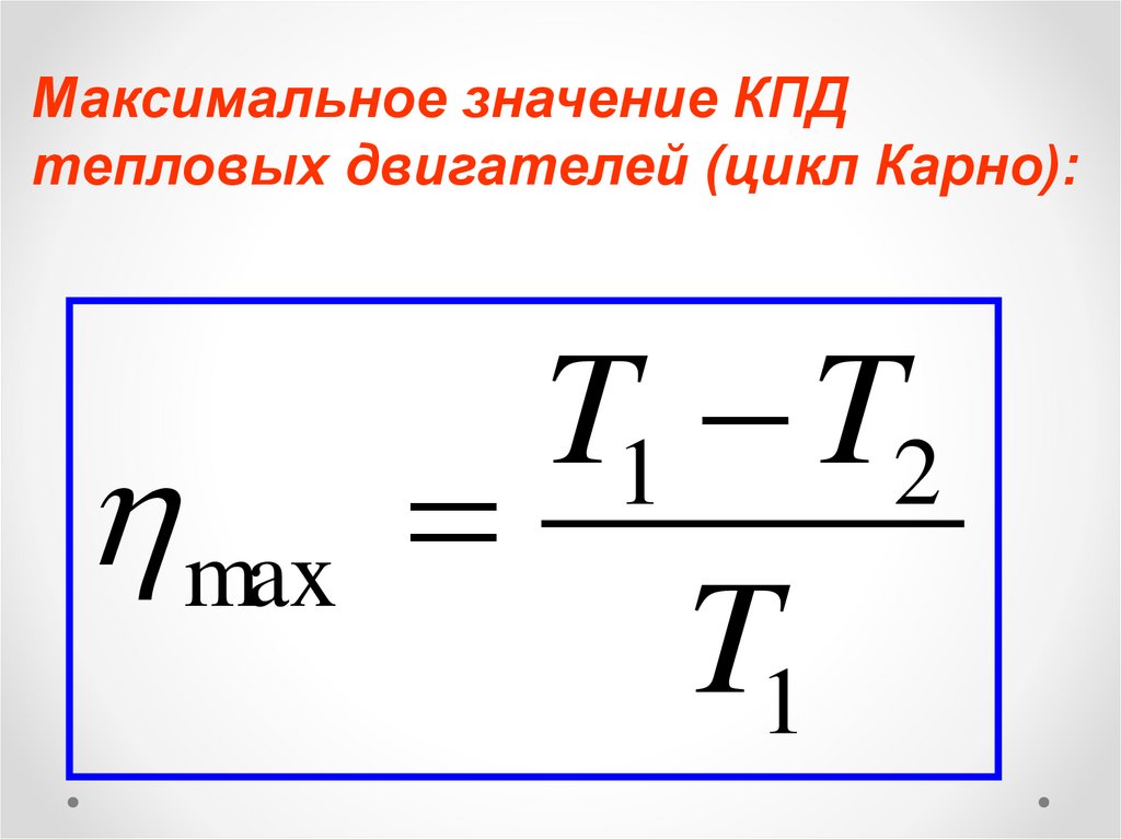 Максимальное значение КПДтепловых двигателей (цикл Карно):