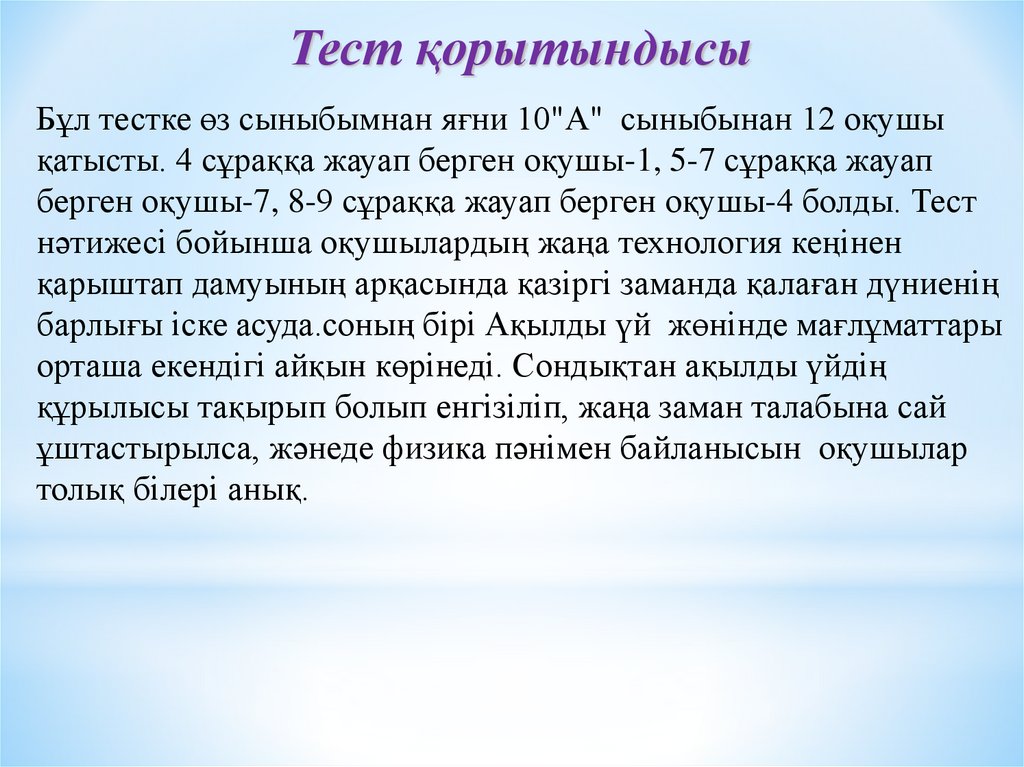 16. Ә.Бөкейханов атындағы мектеп-лицейінің 10А сынып оқушыларының «»Ақылды үй атты ғылыми жұмыста жүргізілген тест көрсеткіші