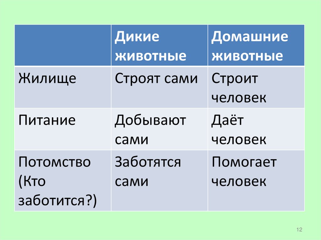 • Домашних животных разводят люди. Людикормят их и защищают, строят для них жилища,