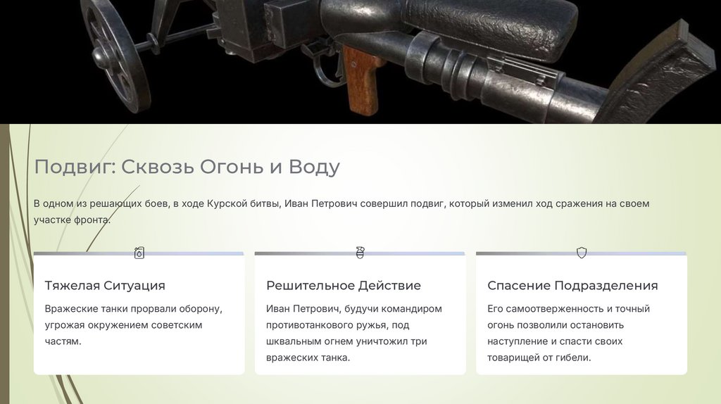 Подвиг: Сквозь Огонь и ВодуВ одном из решающих боев, в ходе Курской битвы, Иван Петрович совершил подвиг, который изменил ход сражения на своем