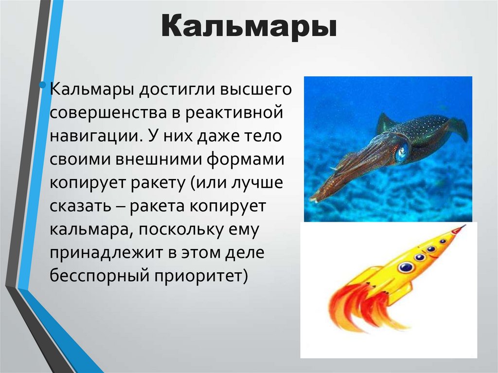 12. Реактивное движение используется многими моллюсками – осьминогами, кальмарами, каракатицами.