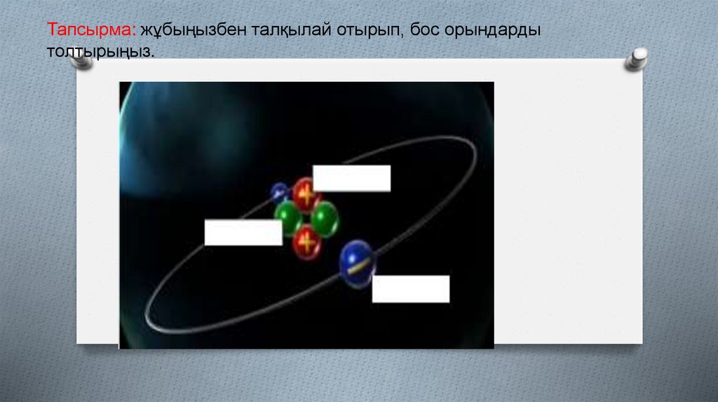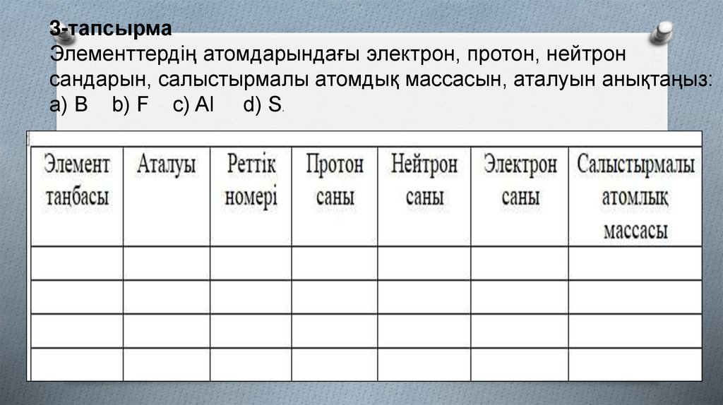 3-тапсырмаЭлементтердің атомдарындағы электрон, протон, нейтрон