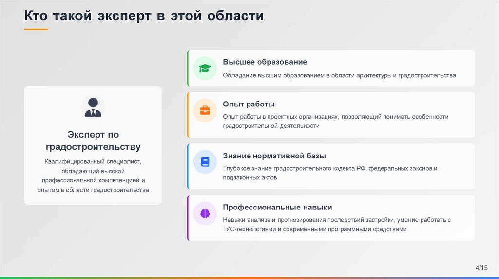 Глубокое знание градостроительного кодекса РФ, федеральных законов и