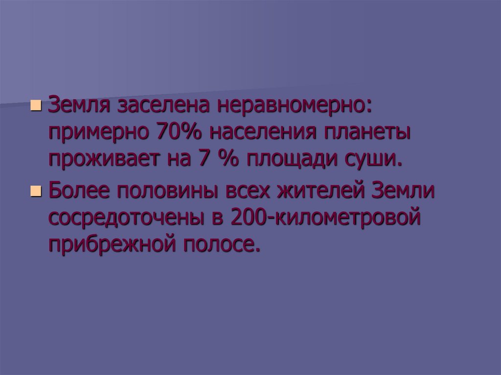 Земля заселена неравномерно:примерно 70% населения планеты