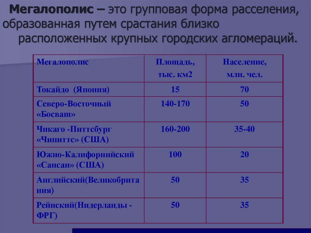 6. Самая большая агломерация мира (выбери верную строку):