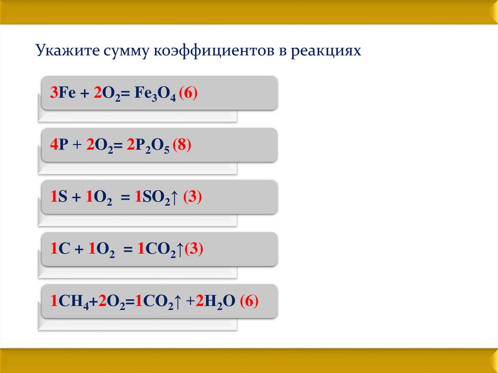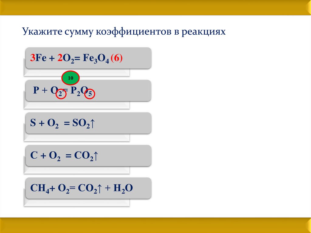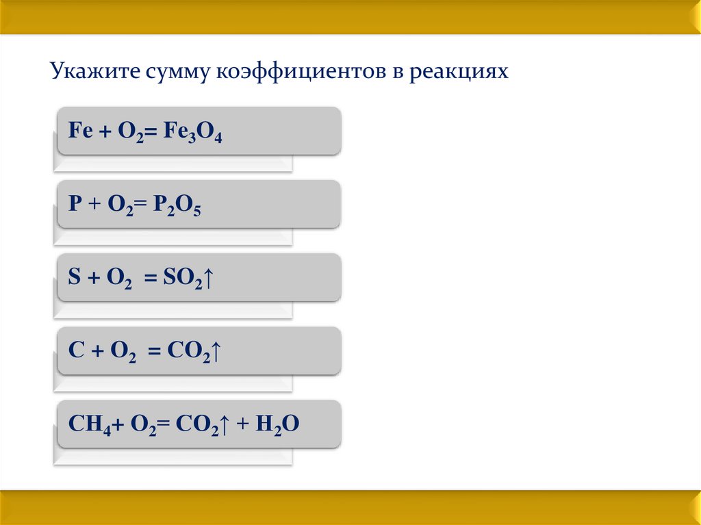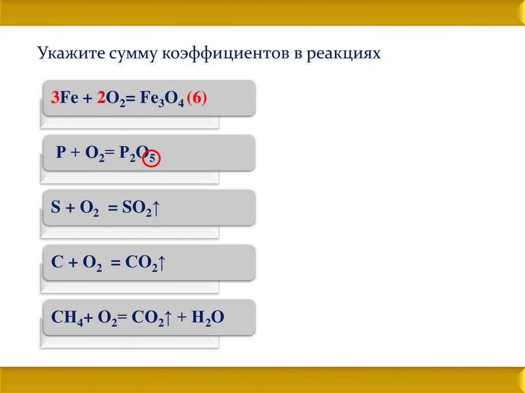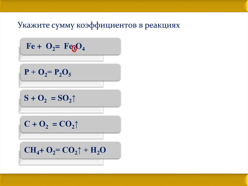 Укажите сумму коэффициентов в реакцияхFe + O2= Fe3O4