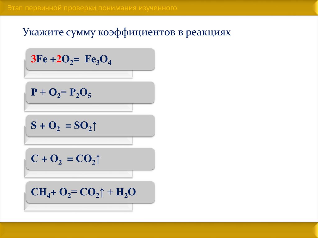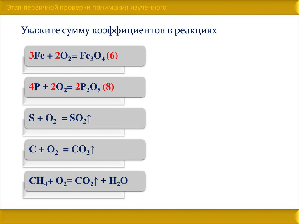 Этап первичной проверки понимания изученногоУкажите сумму коэффициентов в реакциях