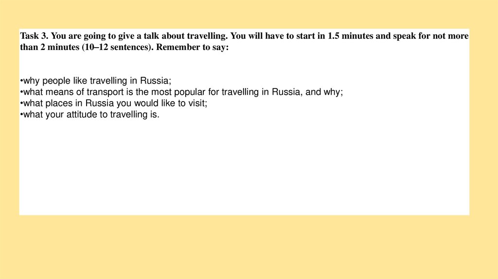 Task 3. You are going to give a talk about travelling. You will have to start in 1.5 minutes and speak for not morethan 2 minutes (10–12 sentences). Remember to say: