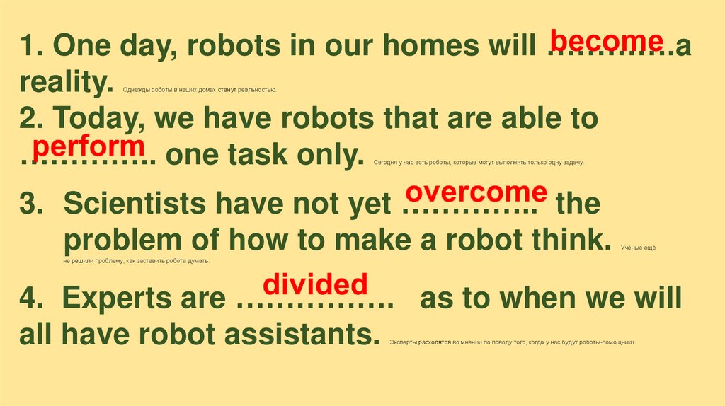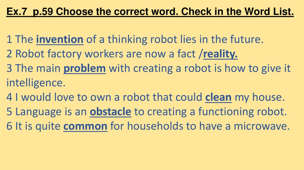 Ex.7 p.59 Choose the correct word. Check in the Word List.1 The invention of a thinking robot lies in the future.