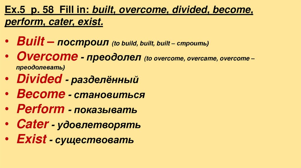 Ex.5 p. 58 Fill in: built, overcome, divided, become,perform, cater, exist.