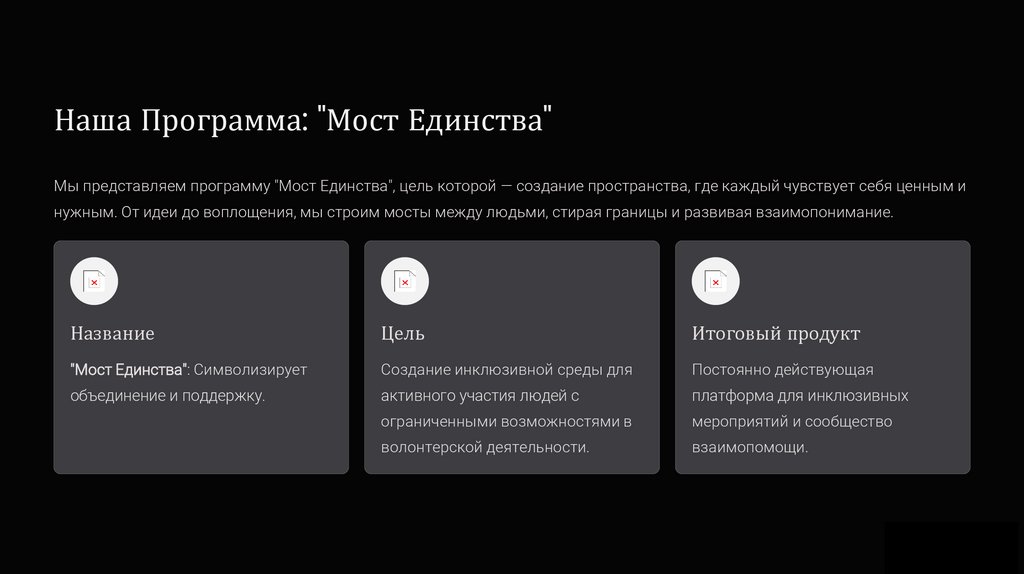 Наша Программа: "Мост Единства"Мы представляем программу "Мост Единства", цель которой — создание пространства, где каждый чувствует себя ценным и
