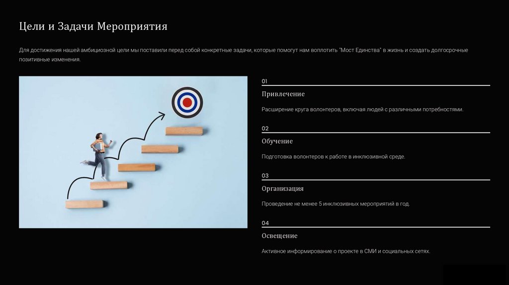 Цели и Задачи МероприятияДля достижения нашей амбициозной цели мы поставили перед собой конкретные задачи, которые помогут нам воплотить "Мост Единства" в жизнь и создать долгосрочные