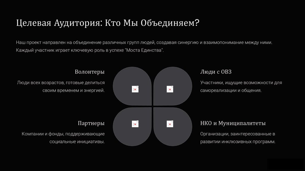 Целевая Аудитория: Кто Мы Объединяем?Наш проект направлен на объединение различных групп людей, создавая синергию и взаимопонимание между ними.