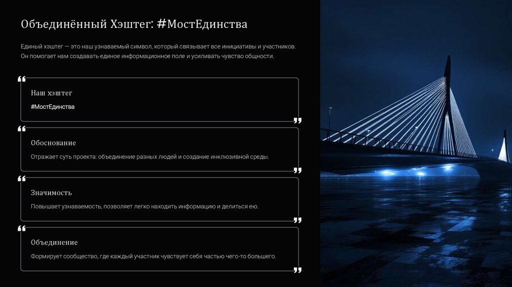 Объединённый Хэштег: #МостЕдинстваЕдиный хэштег — это наш узнаваемый символ, который связывает все инициативы и участников.