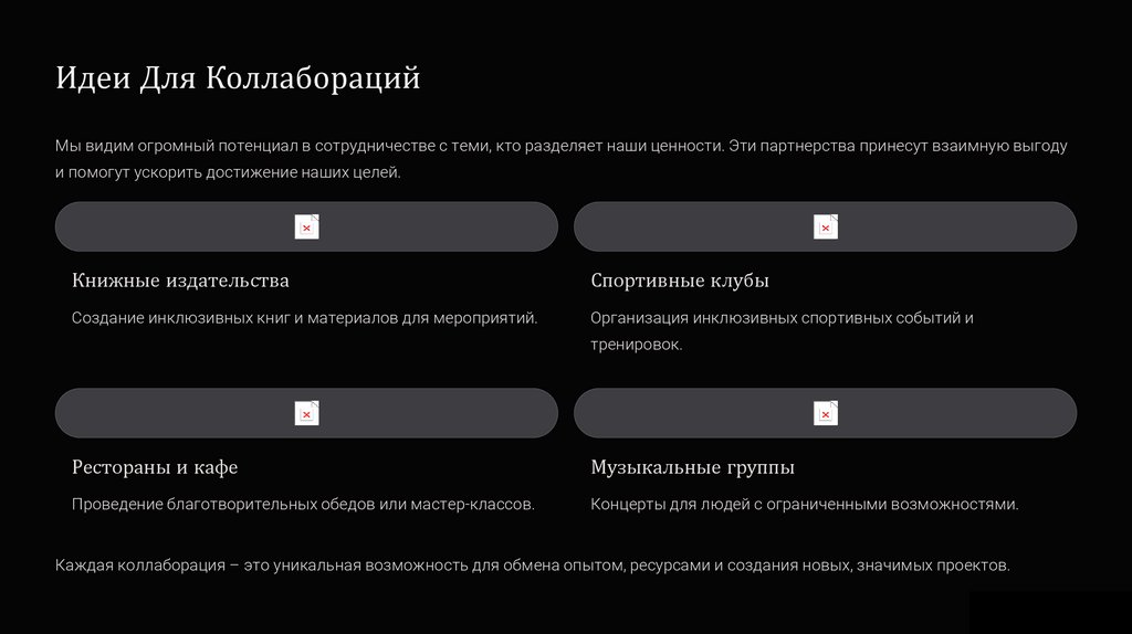 Идеи Для КоллаборацийМы видим огромный потенциал в сотрудничестве с теми, кто разделяет наши ценности. Эти партнерства принесут взаимную выгоду