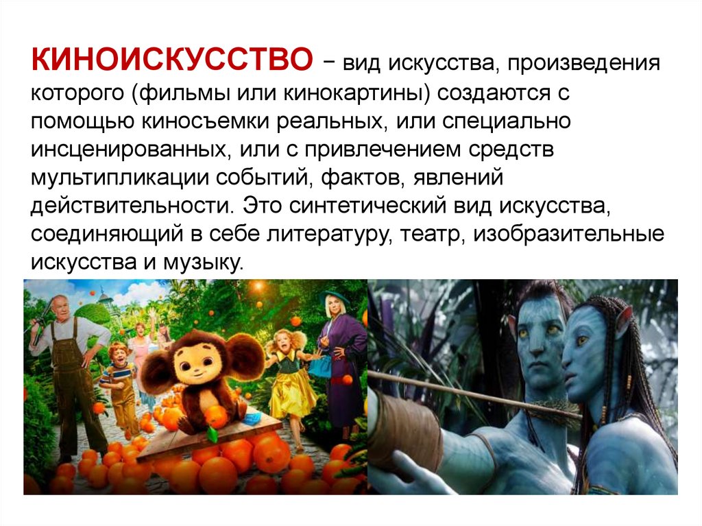 КИНОИСКУССТВО − вид искусства, произведениякоторого (фильмы или кинокартины) создаются с