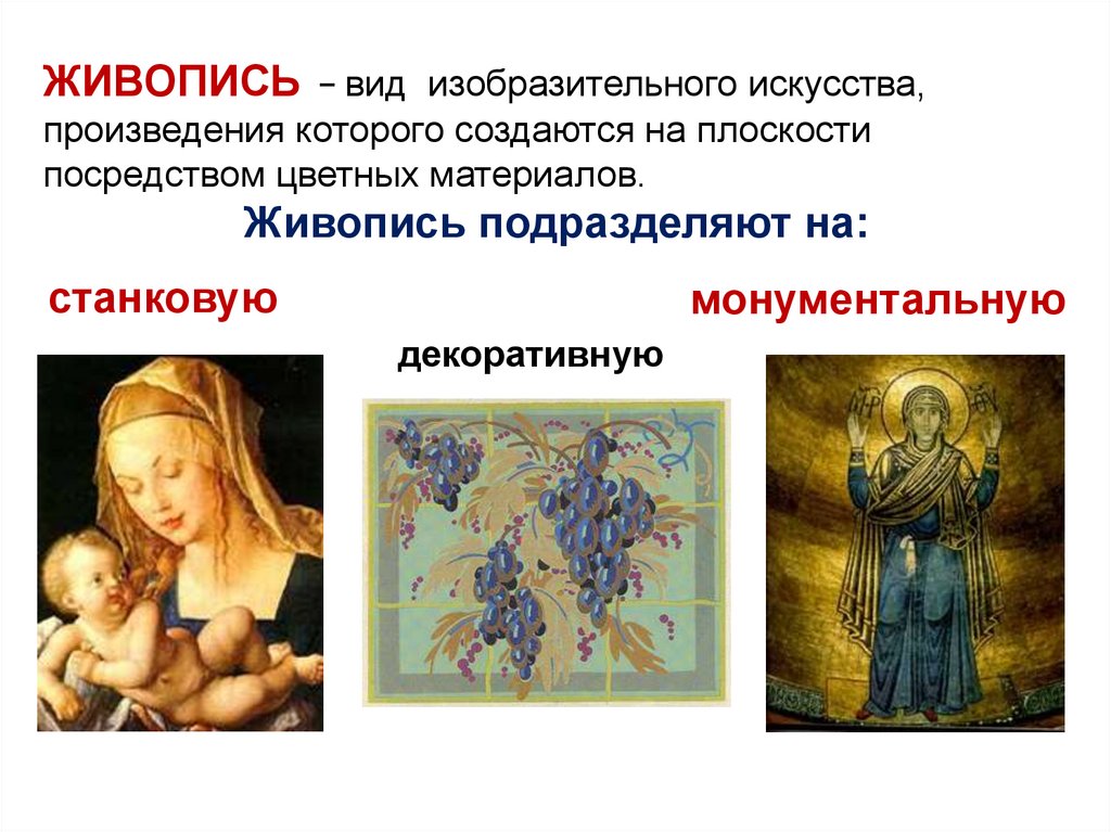 Особыми видами живописи являются: иконопись, миниатюра,фреска, театрально-декорационная живопись, диорама и панорама.