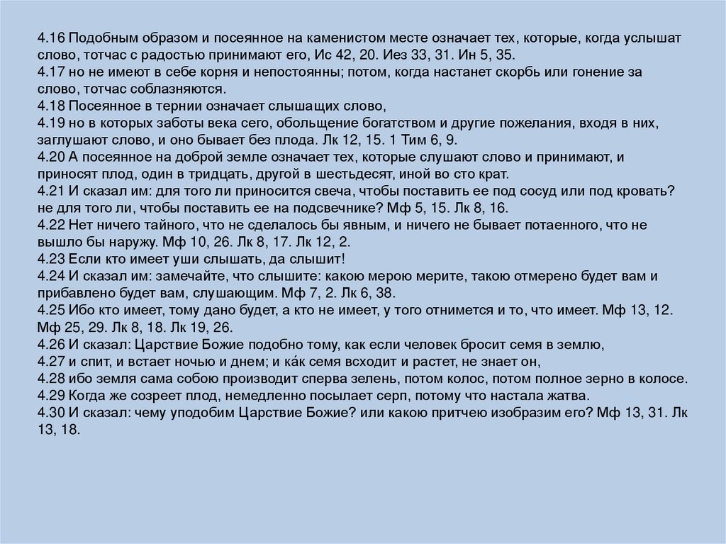 4.20 А посеянное на доброй земле означает тех, которые слушают слово и принимают, и