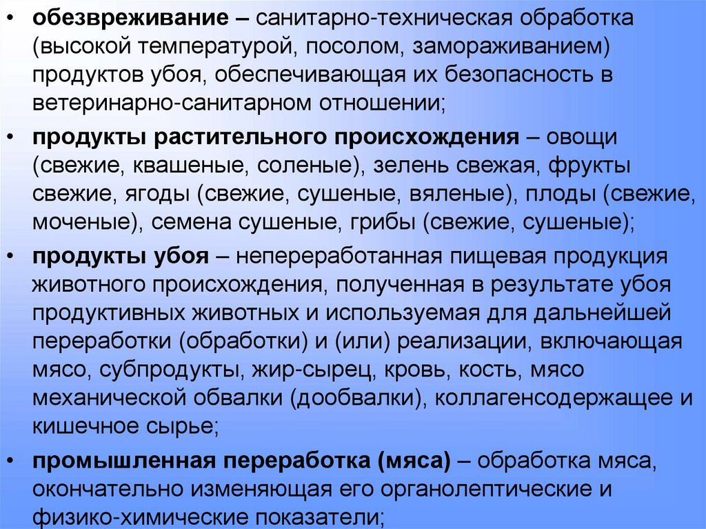 • обезвреживание – санитарно-техническая обработка(высокой температурой, посолом, замораживанием)