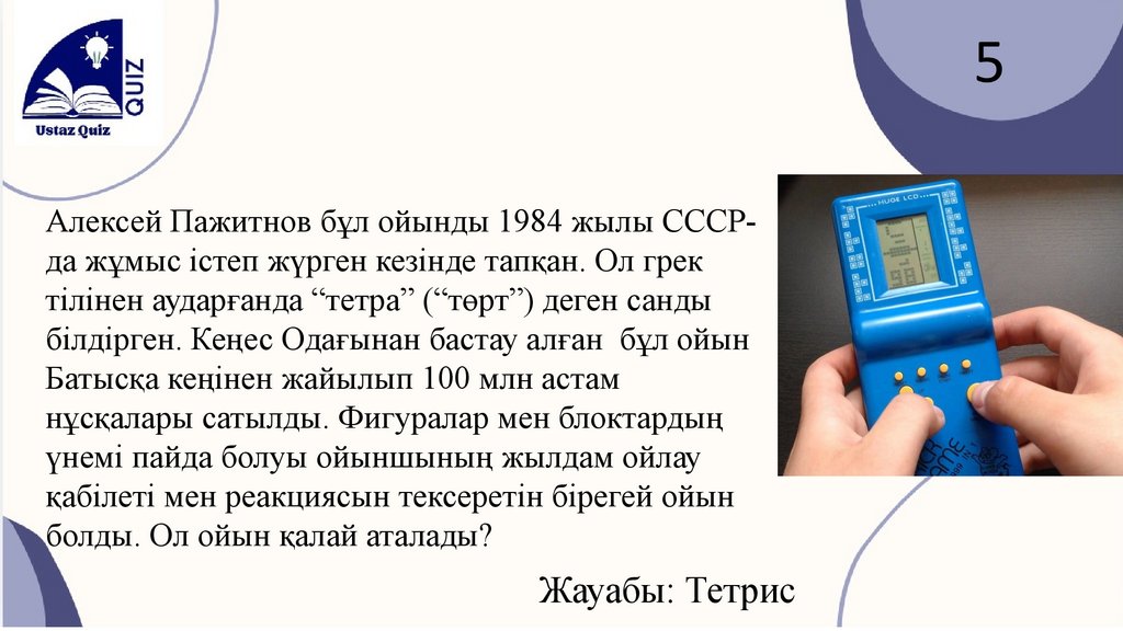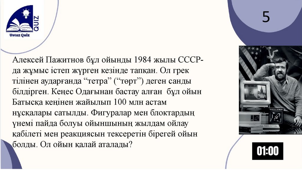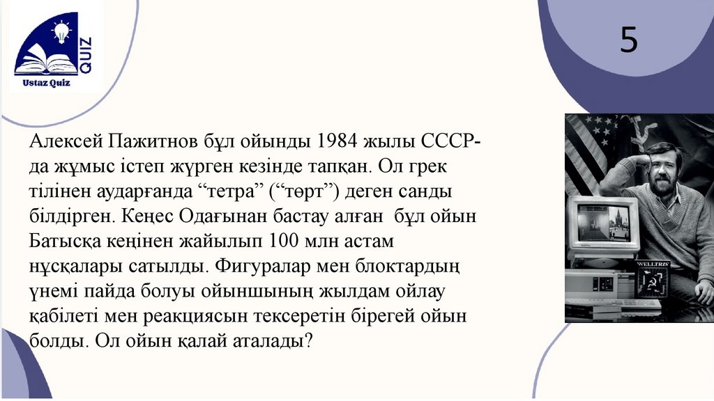 5Алексей Пажитнов бұл ойынды 1984 жылы СССРда жұмыс істеп жүрген кезінде тапқан. Ол грек