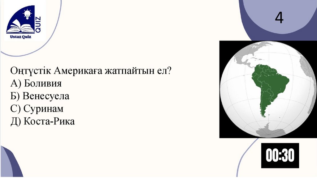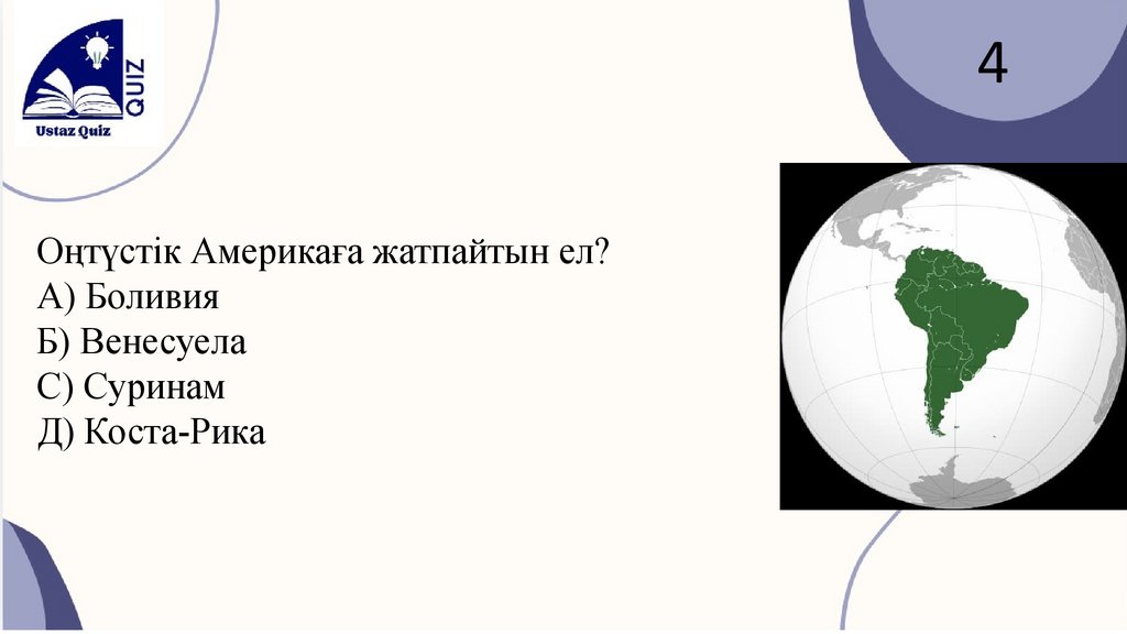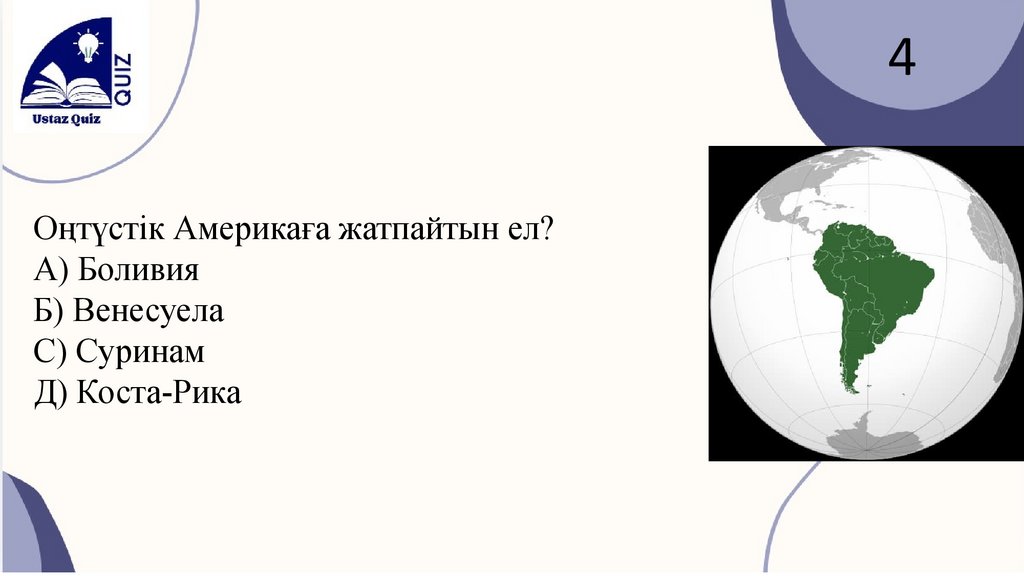 4Оңтүстік Америкаға жатпайтын ел?
