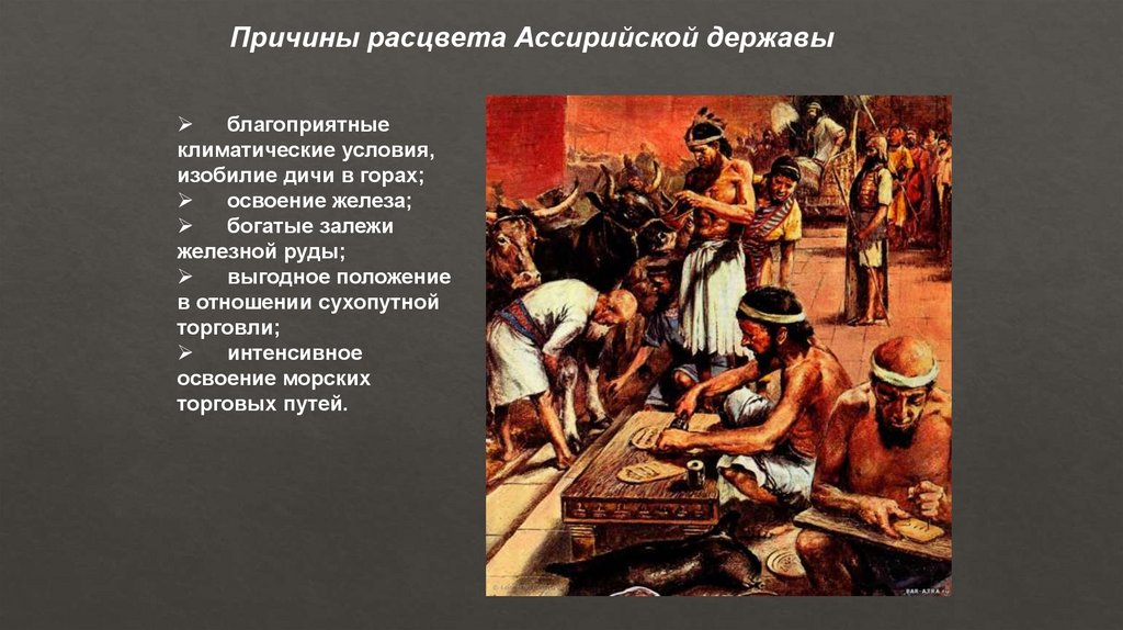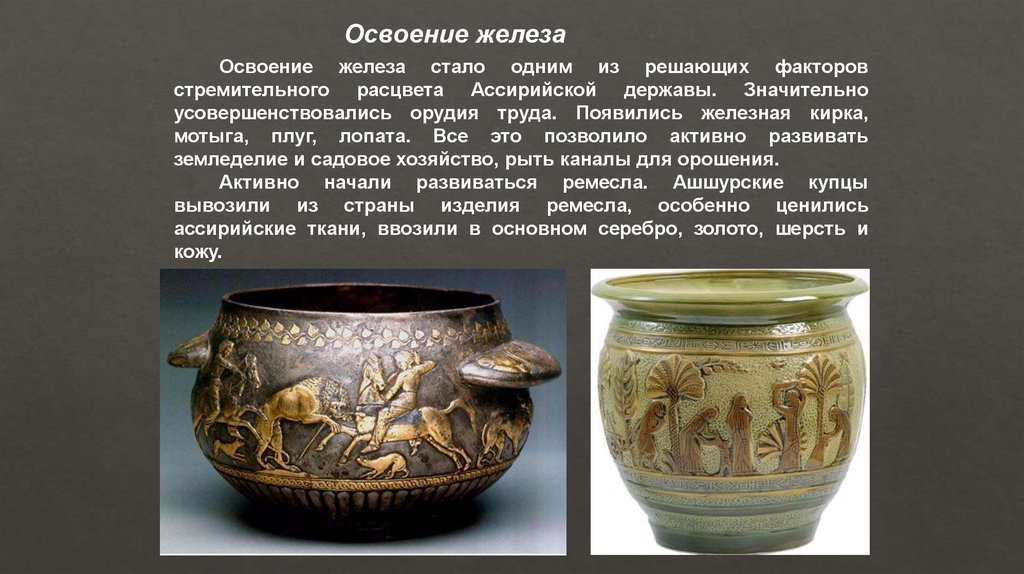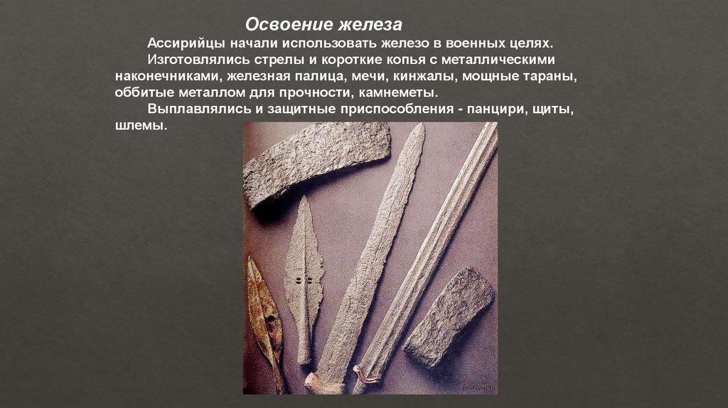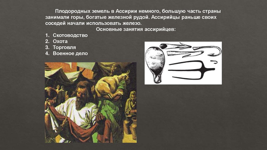 Плодородных земель в Ассирии немного, большую часть странызанимали горы, богатые железной рудой. Ассирийцы раньше своих