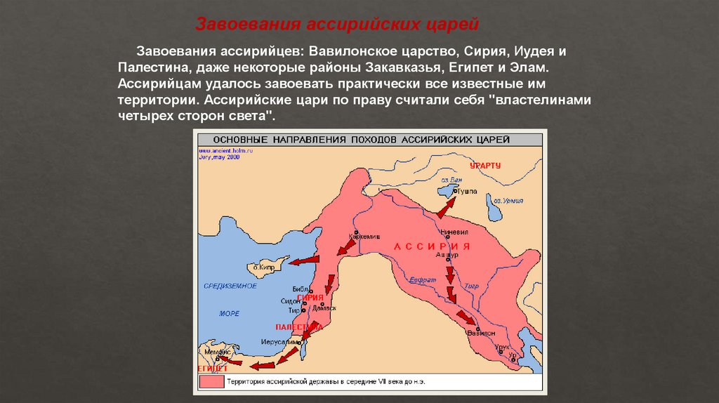 Завоевания ассирийских царейЗавоевания ассирийцев: Вавилонское царство, Сирия, Иудея и