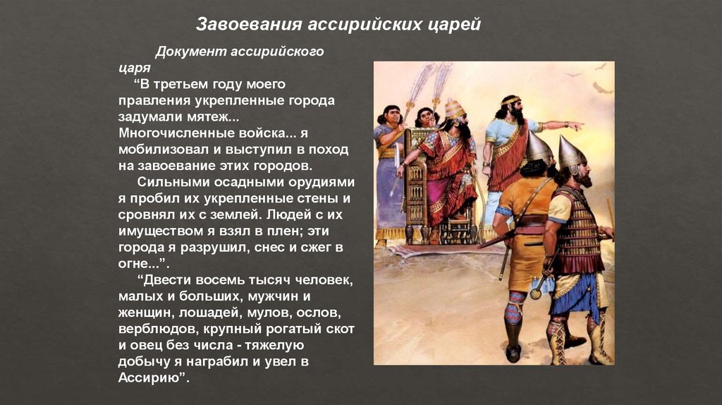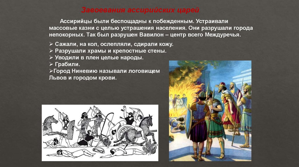 Завоевания ассирийских царейАссирийцы были беспощадны к побежденным. Устраивали