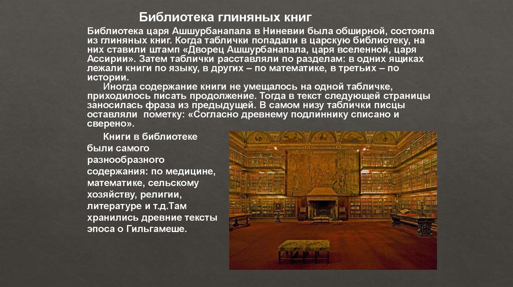 Библиотека глиняных книгБиблиотека царя Ашшурбанапала в Ниневии была обширной, состояла