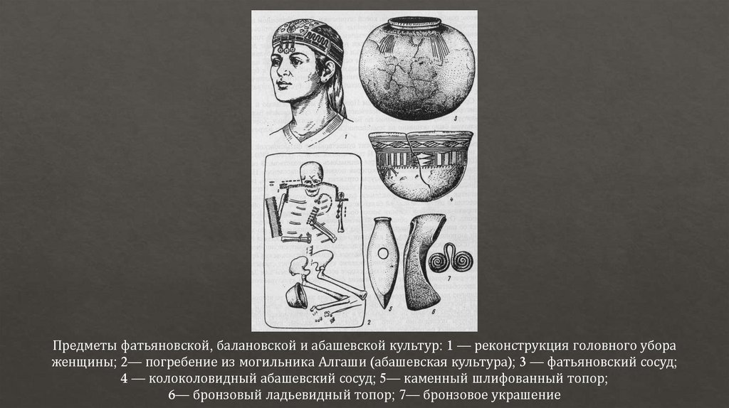 Предметы фатьяновской, балановской и абашевской культур: 1 — реконструкция головного убораженщины; 2— погребение из могильника Алгаши (абашевская культура); 3 — фатьяновский сосуд;
