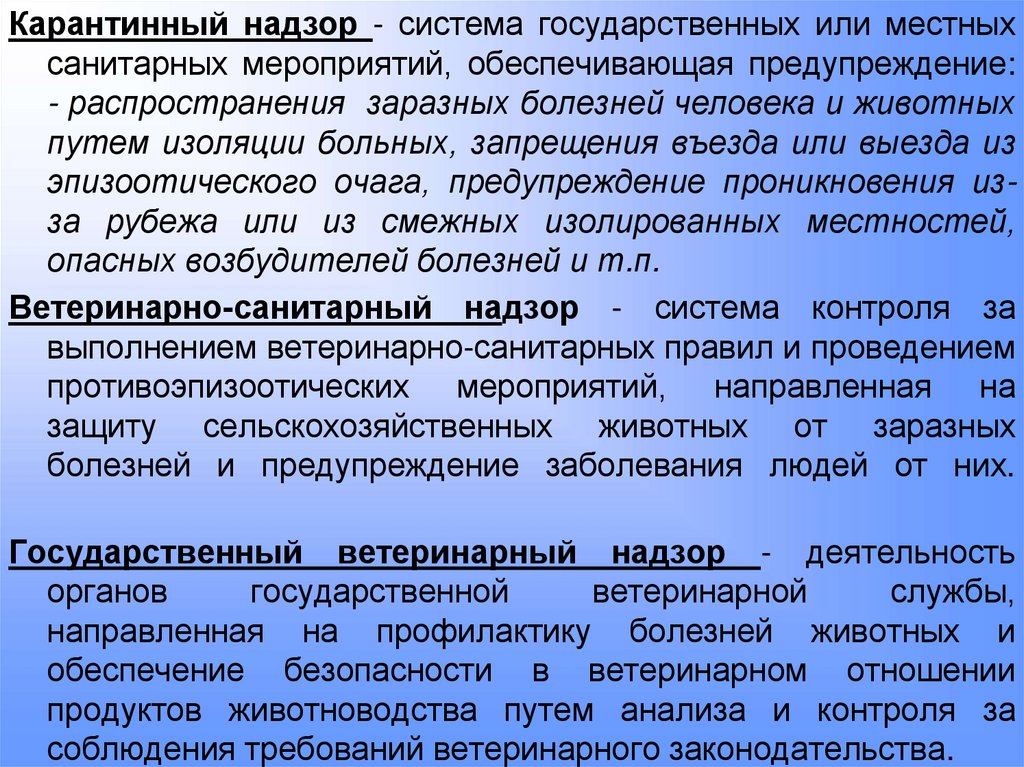 Карантинный надзор - система государственных или местныхсанитарных мероприятий, обеспечивающая предупреждение: